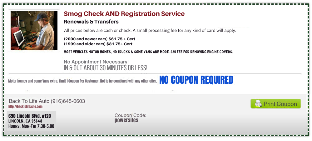 Back to life auto is a smog station you can trust. We have been serving the Lincoln community for 30 years. We smog all kinds of vehicles including Trucks, Cars and Motorhomes. Our smog checks are reliable and trustworthy. They also satisfy the DMV requirements. Come on by, no appointment is necessary! We will have you in and out in 30 minutes or less. Don’t wait in line at DMV! Now offering Registration Service!